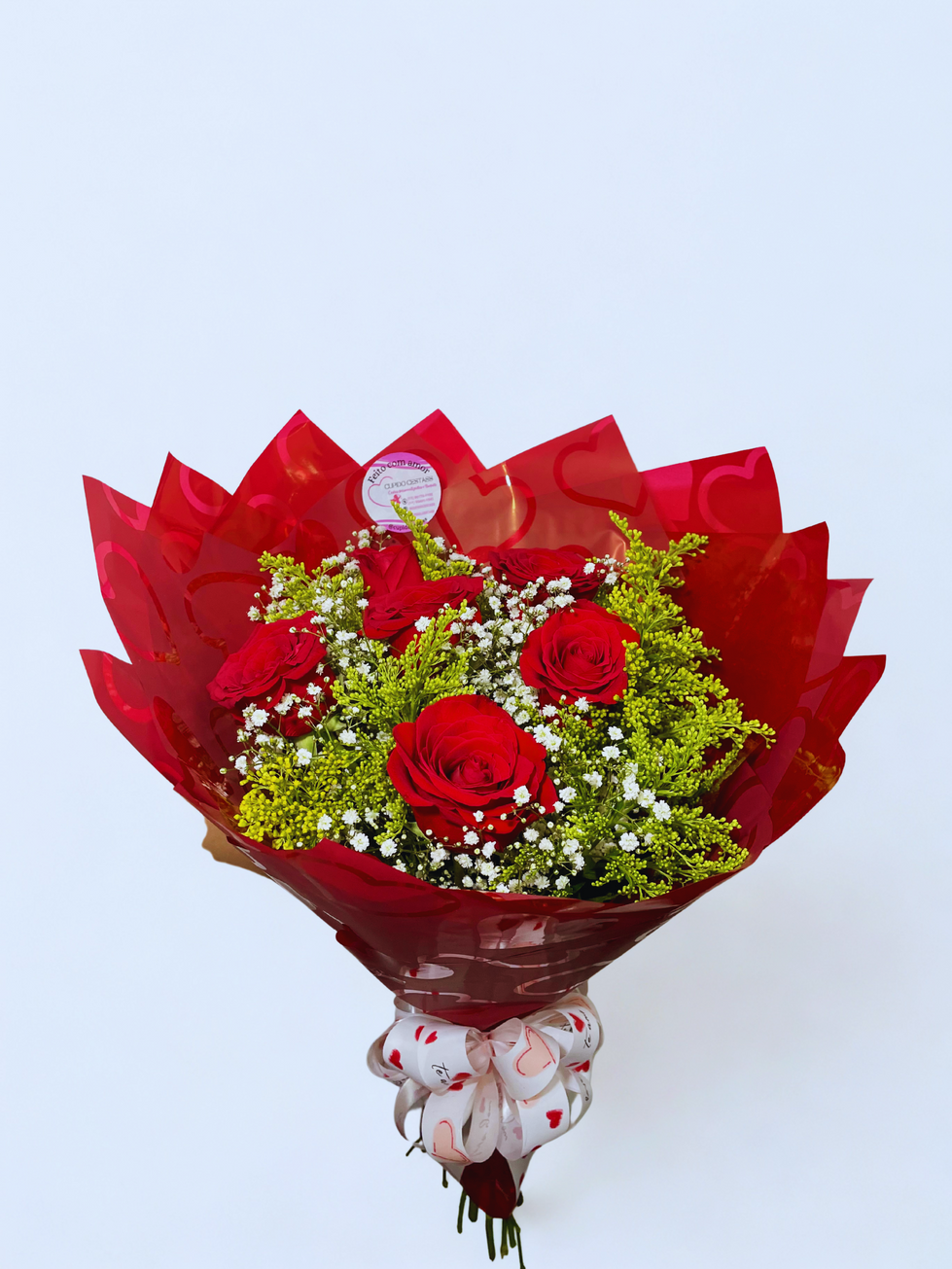 Esse buquĂŞ traz 6 rosas vermelhas, sĂmbolo eterno do amor e da paixĂŁo, combinadas com folhagens naturais que realçam sua beleza e dĂŁo um toque especial de frescor.
